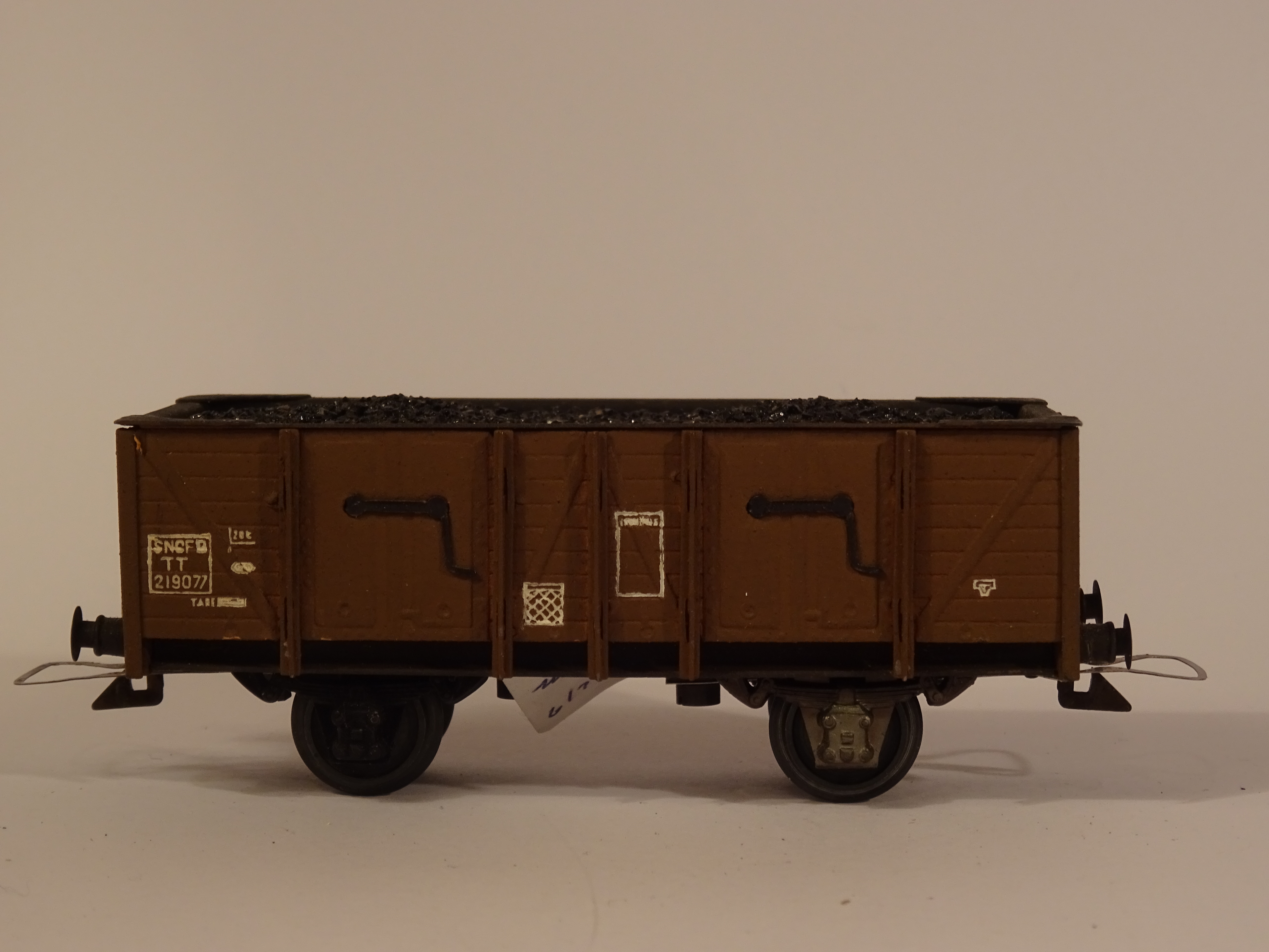 Der Wagen hat Federpuffer, ist vom Typp Holz und hat eine Ladung Kohle