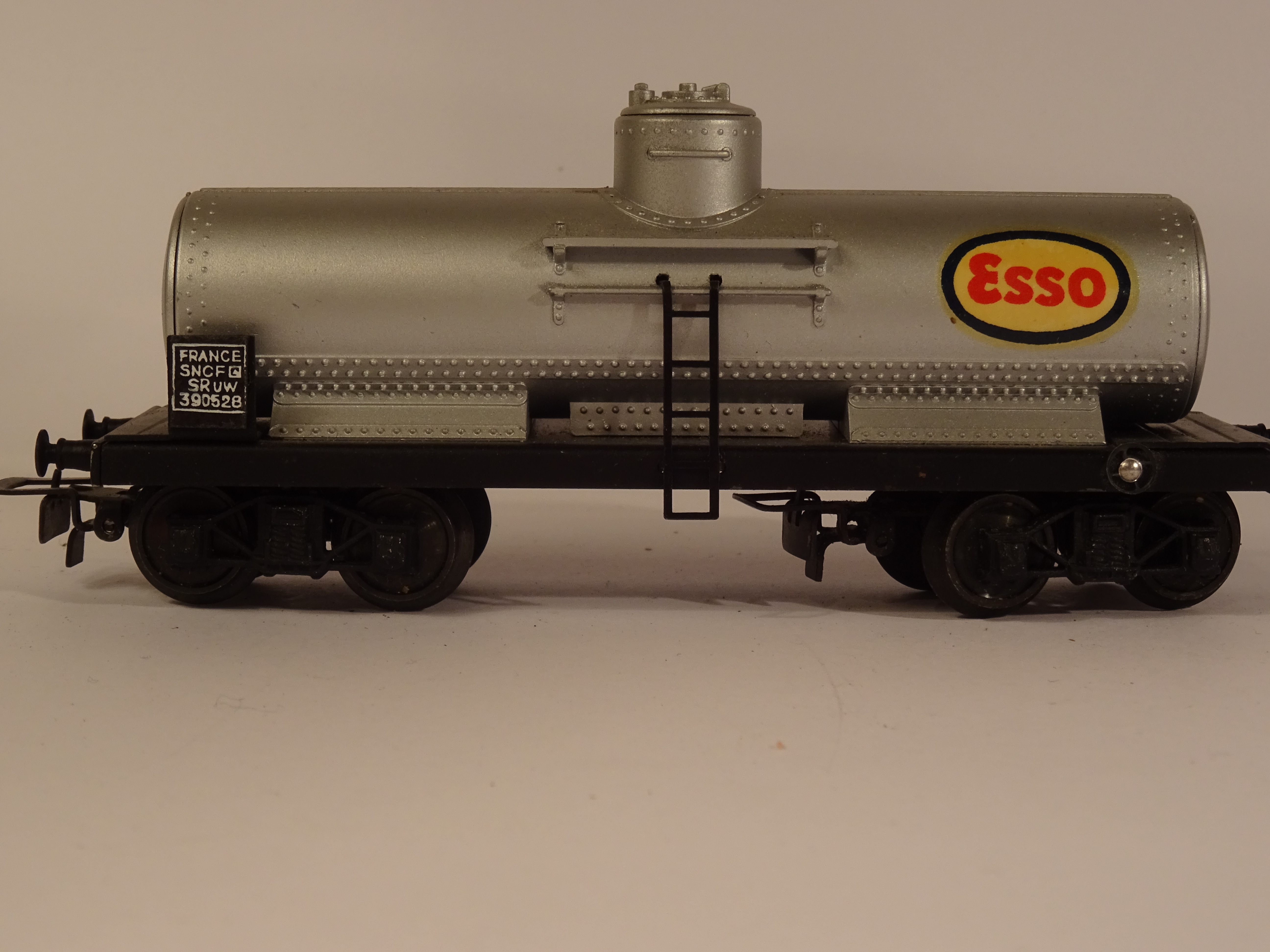 Der Wagen hat feste Puffer, einen silbernen Zylinder und rechts einen Kleber Esso.
