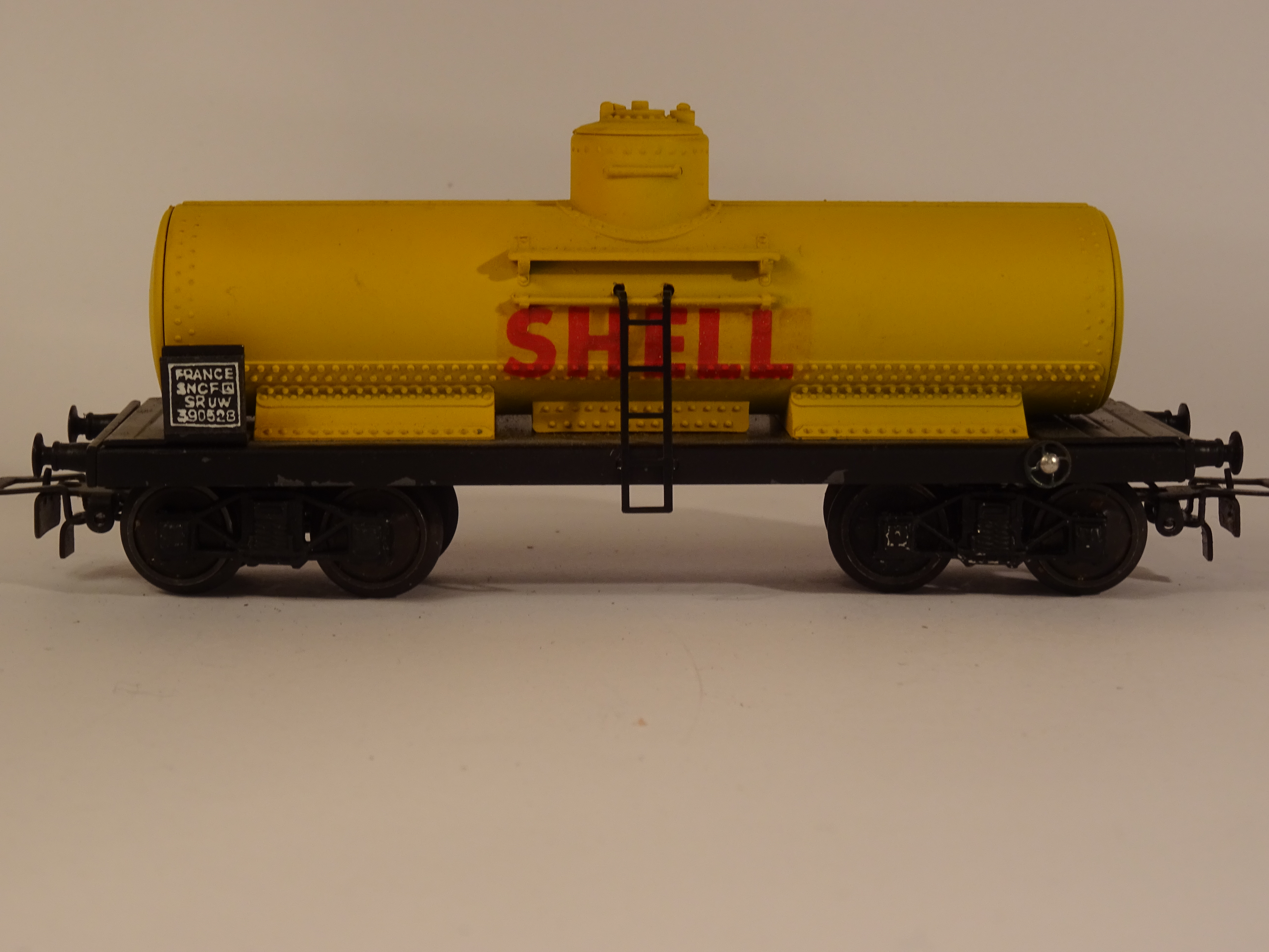 Der Wagen hat feste Puffer, einen gelben Zylinder und ein