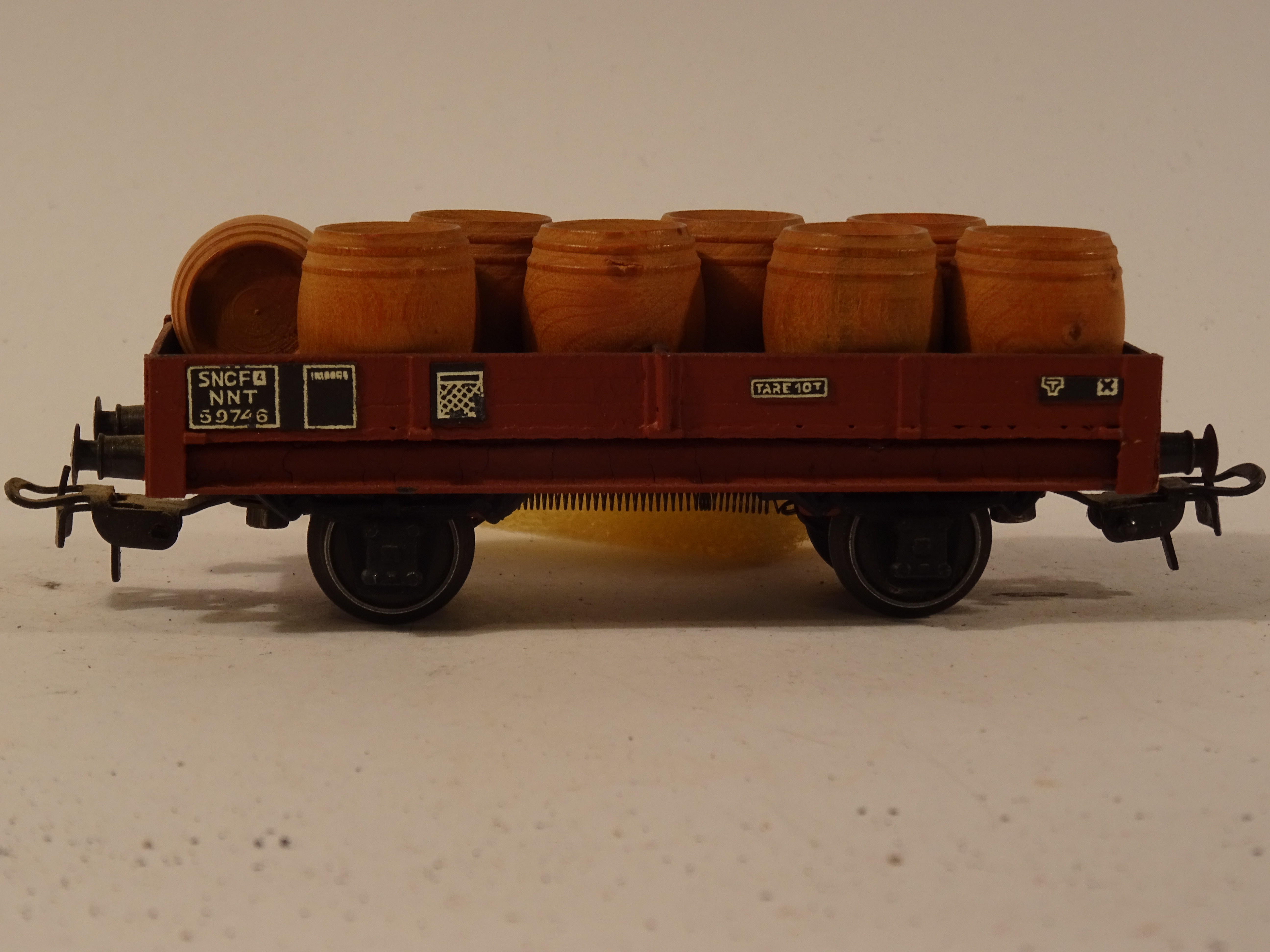 Der Wagen hat Federpuffer. Die Ladung (Fässer) sind aus Holz und stammen von VB.