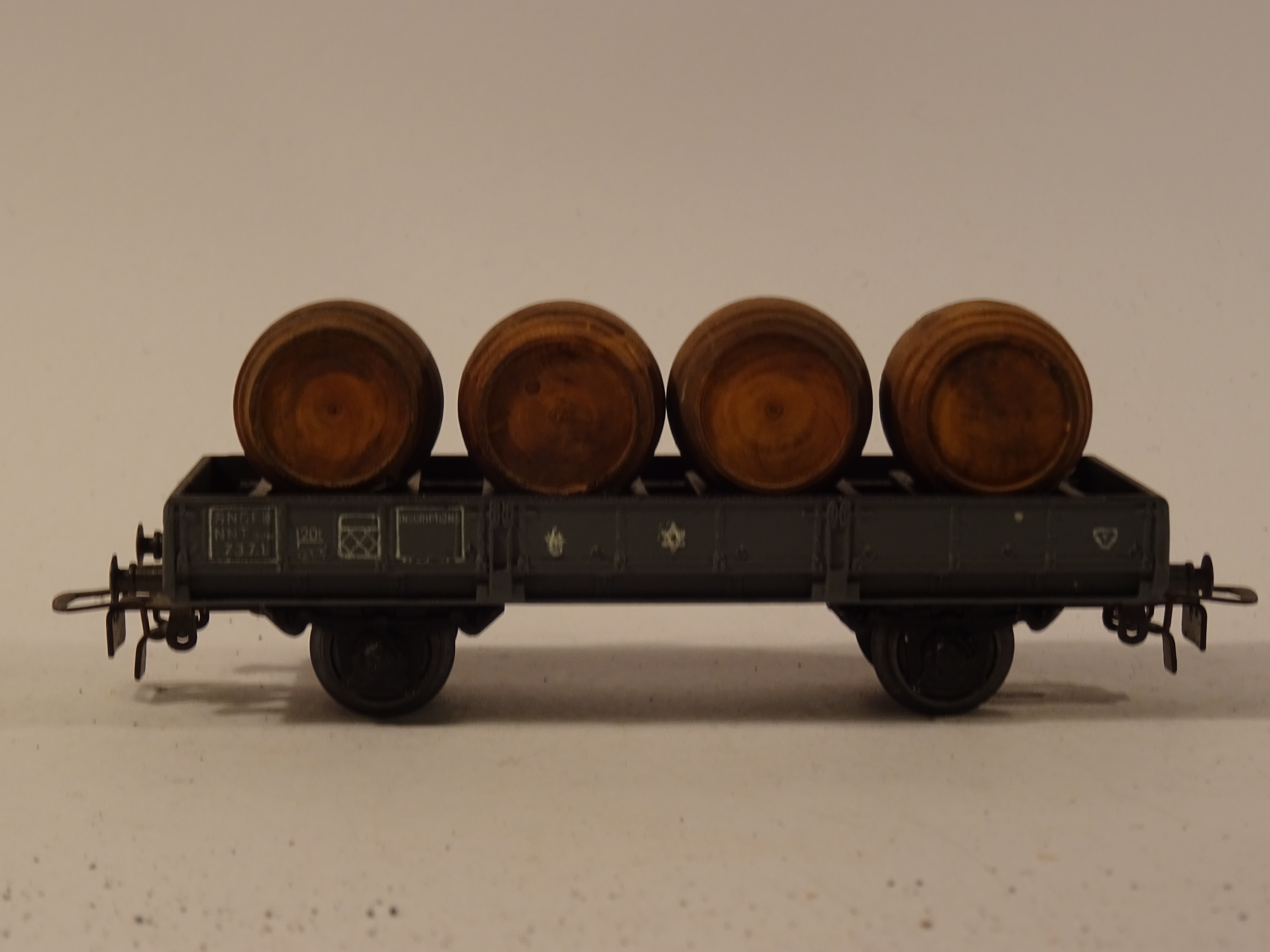 Der Wagen hat feste Puffer. Die 4 grossen Fässer sind aus Holz, sie stammen von VB.