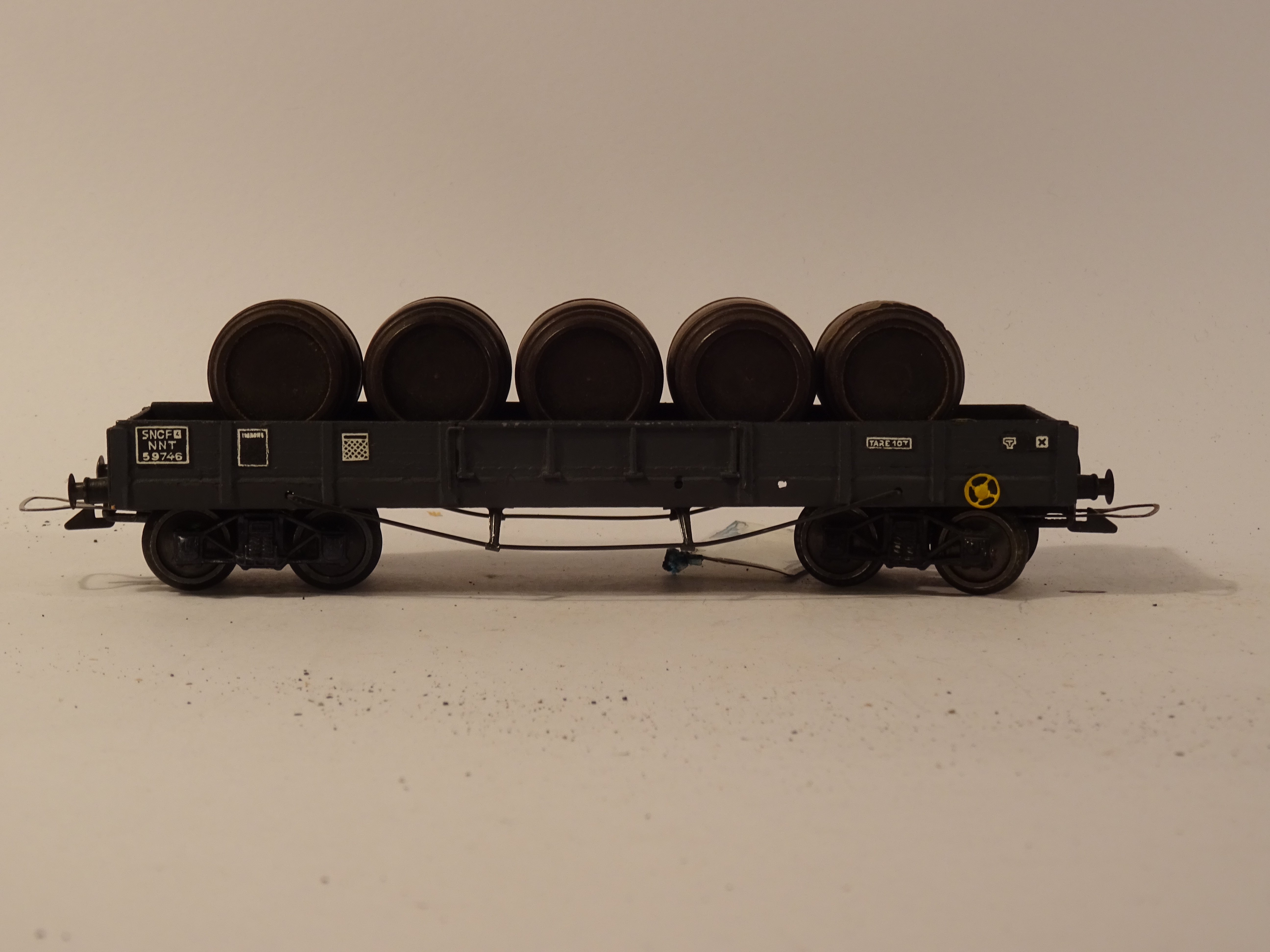 Der Wagen hat Federpuffer. Die 5 Fässer sind dunkel.