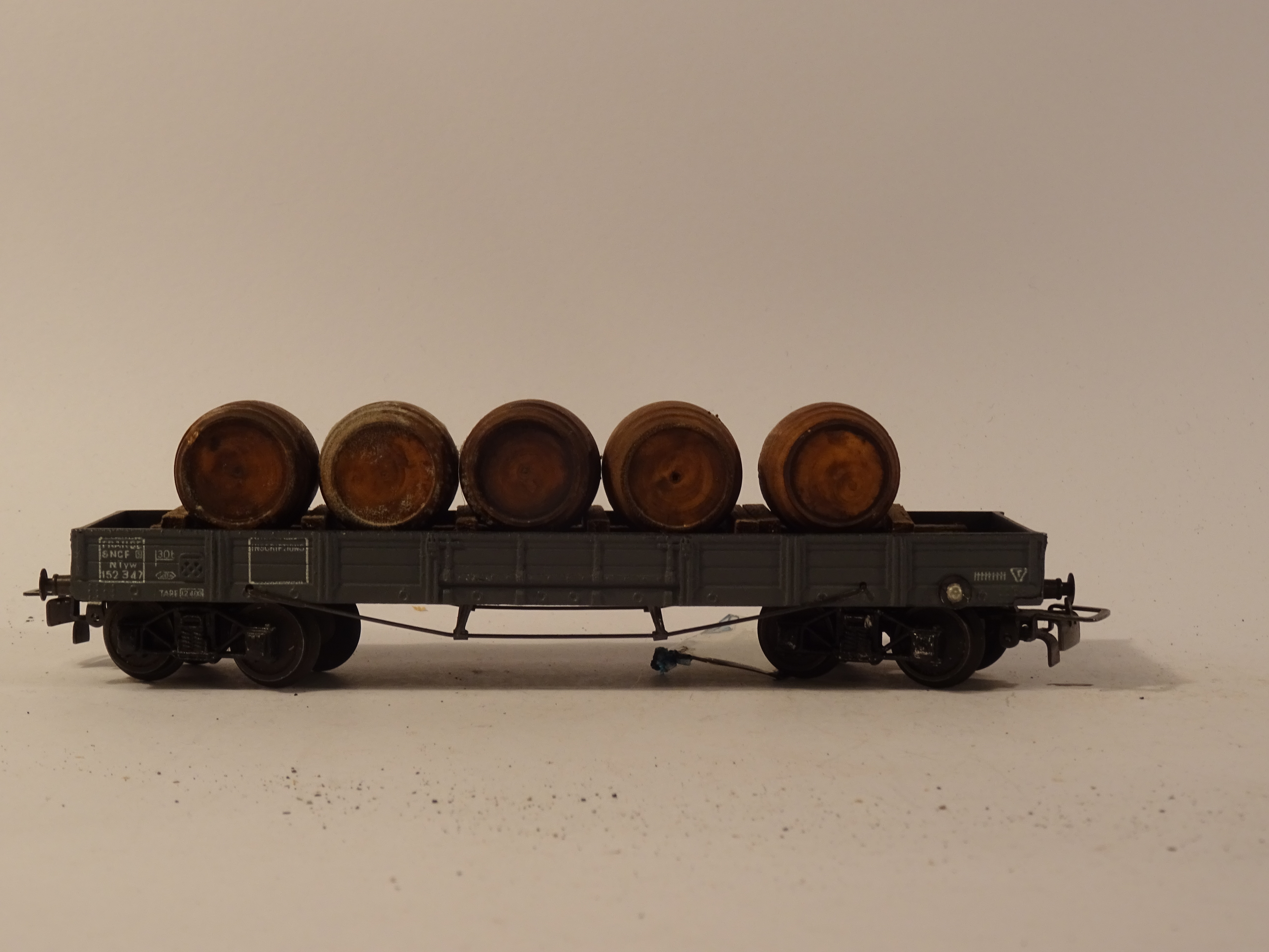 Der Wagen hat feste Puffer. Die 5 Fässer (reltiv hell) sind aus Holz und stammen von VB.