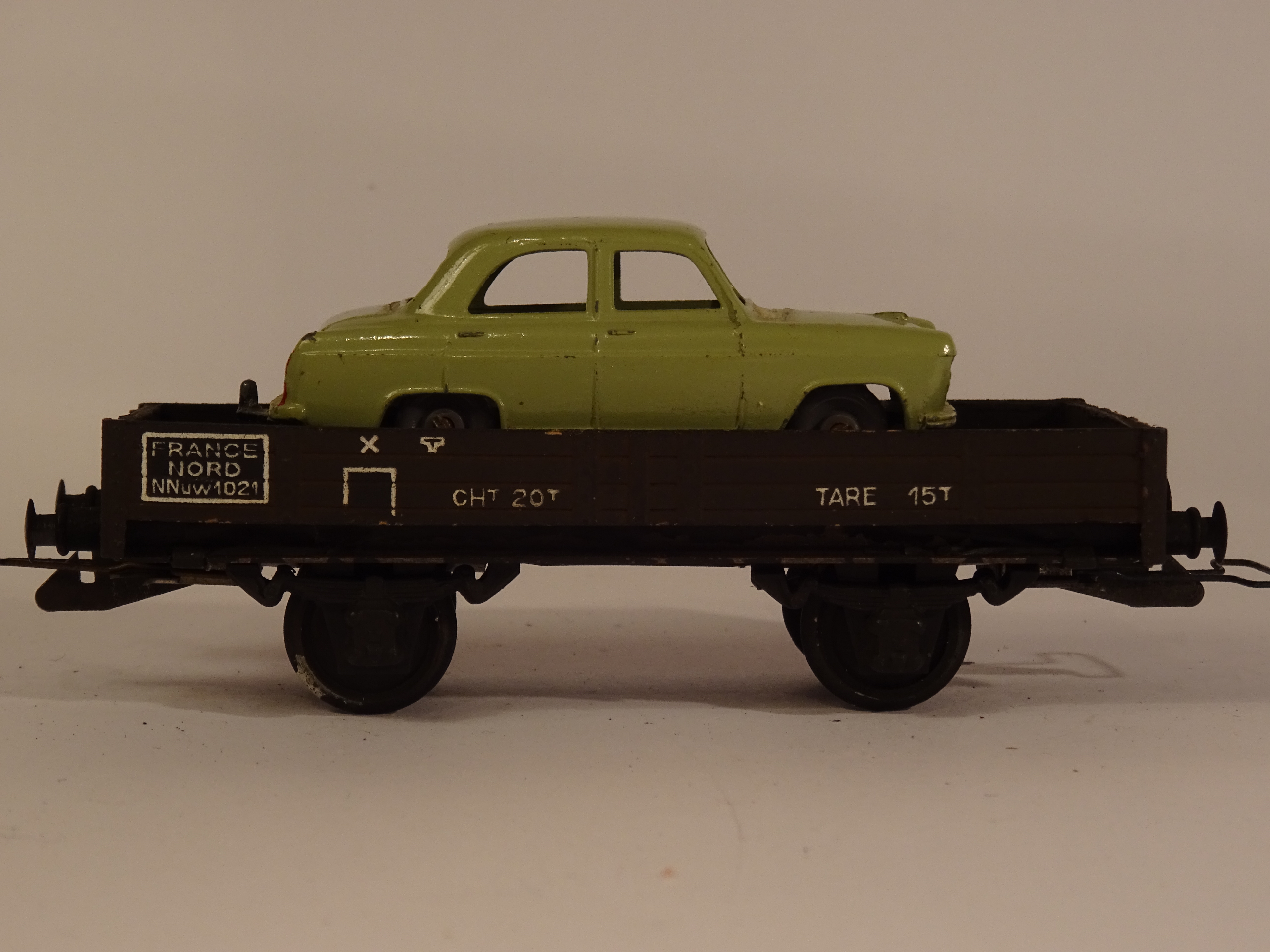 Niederbordwagen 2-Achs braun mit gelbem Norev-Auto