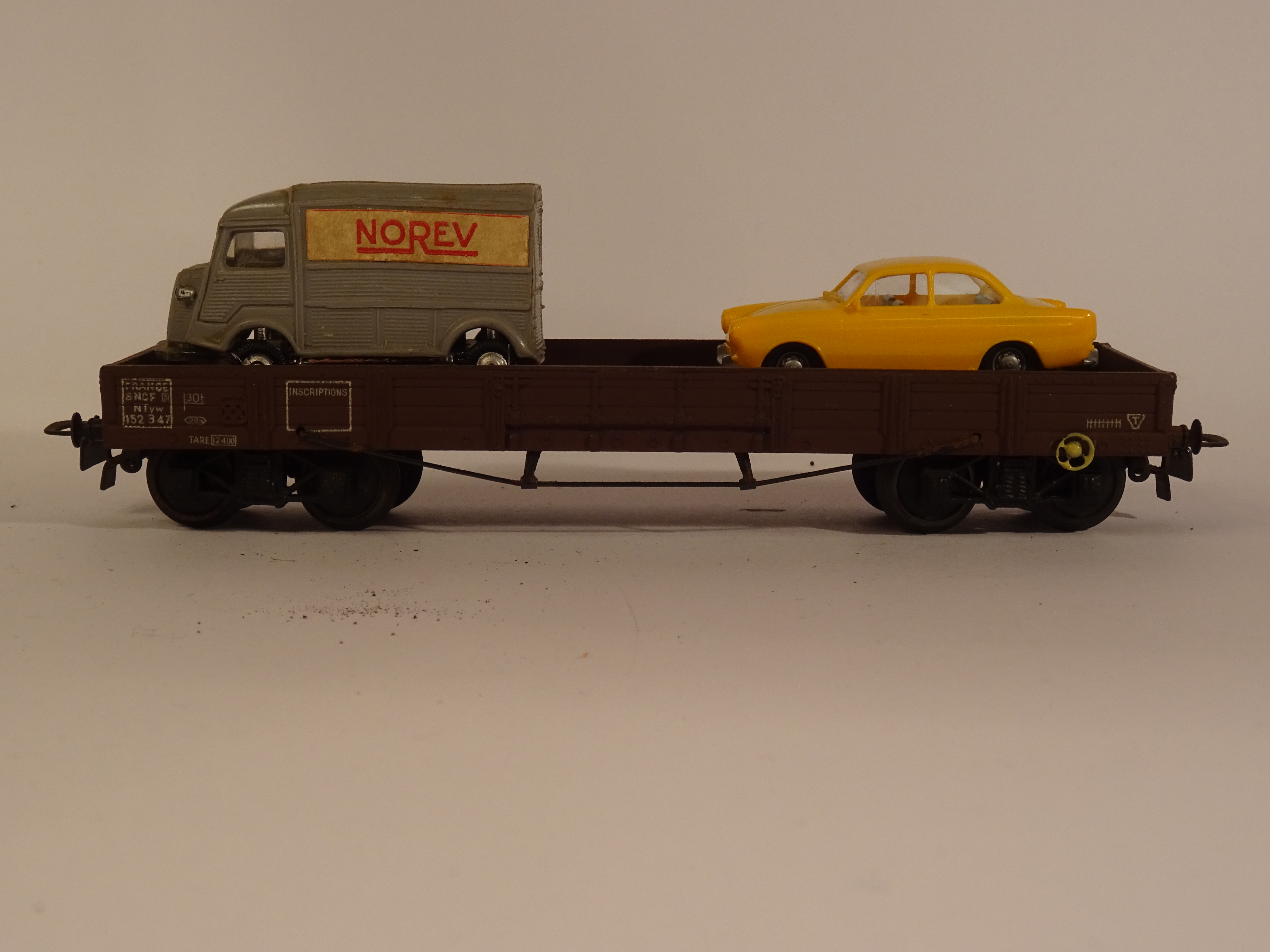 Der Wagen hat feste Puffer. Die Ladung besteht aus einem grauen Auto, mit NOREV angeschriebenen und einem gelben Auto.