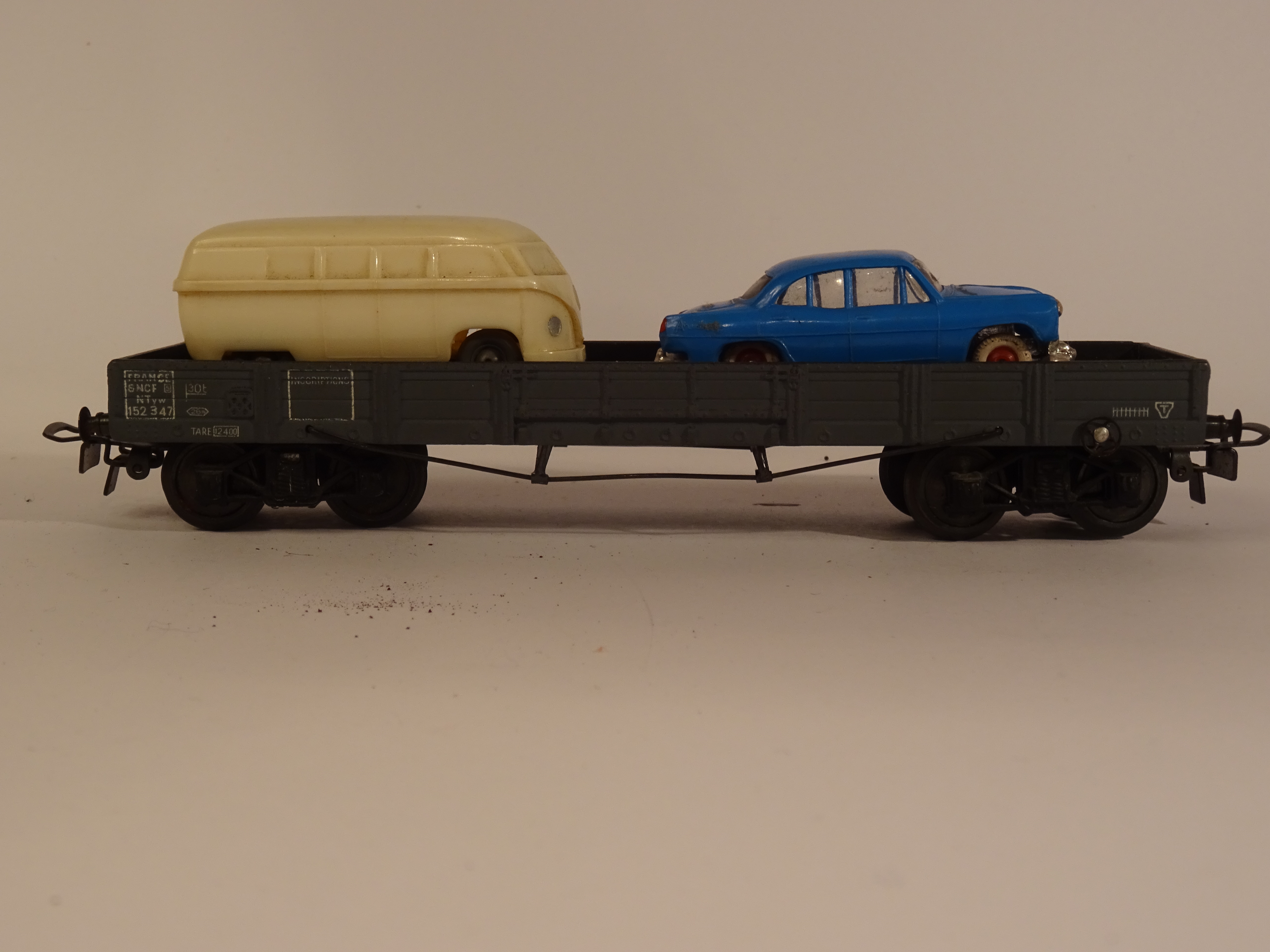 Der Wagen hat feste Puffer. Er ist beladen mit einem Auto von Wiking (VW Bus weiss, unverglast, resp. Scheiben weiss) und einem blauen Simca. Das Gewicht versteht sich ohne Ladung, der Schätzpreis mit Ladung erhöht sich um Fr. 50.