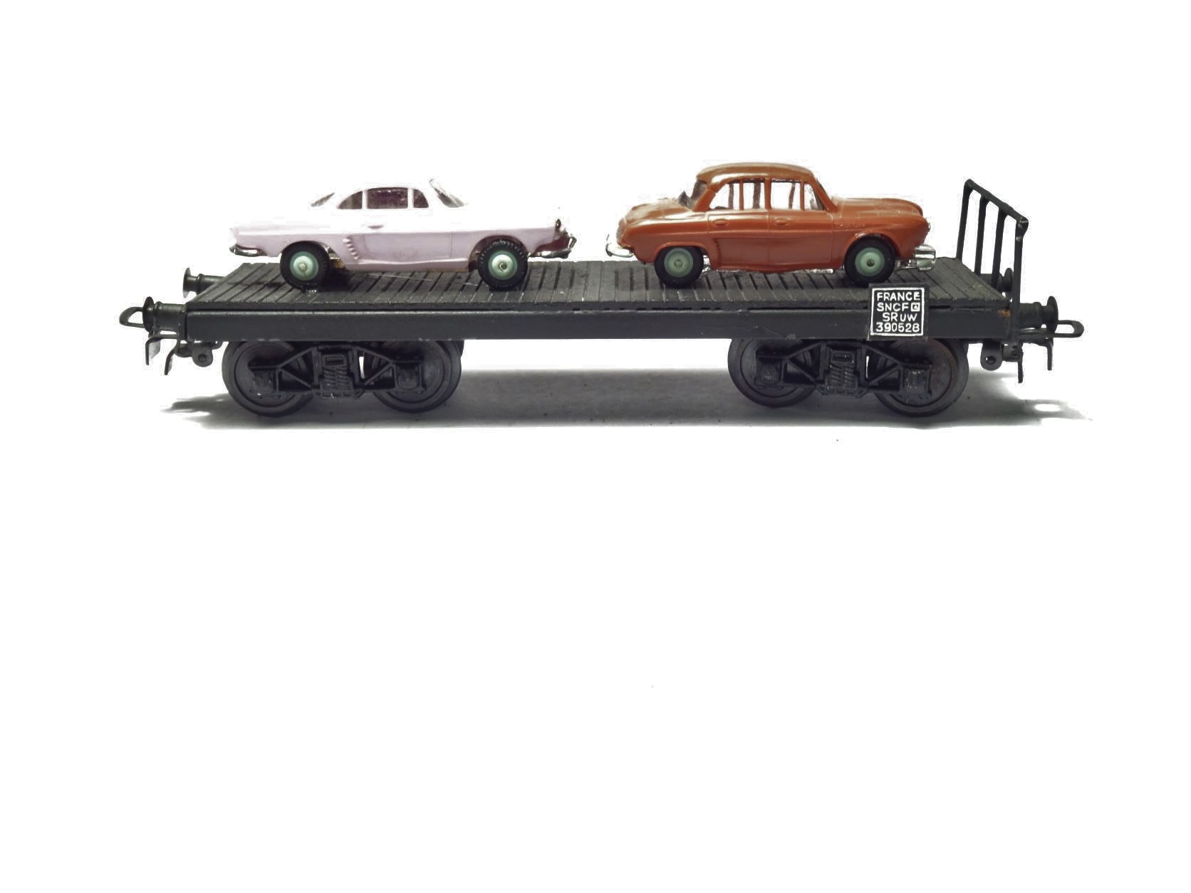 Der Wagen ist 2 Autos (braun und rosa) von Norev beladen und hat Federpuffer. Die Autos sind eventuell nicht von VD.
