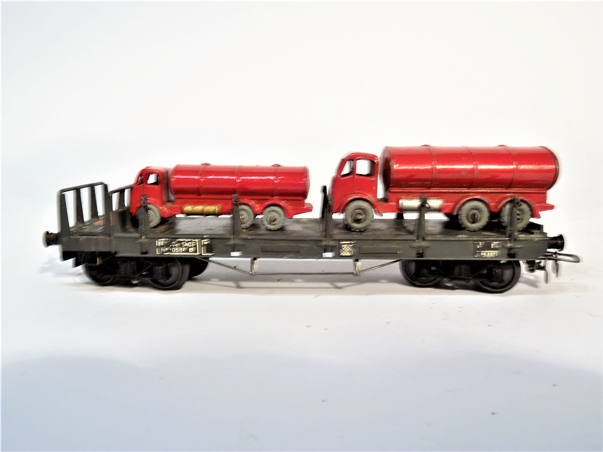 Die beiden roten Tankwagen sind von Lesney (in verschiedenen Massstäben), der Wagen hat Federpuffer und 4-Achsen